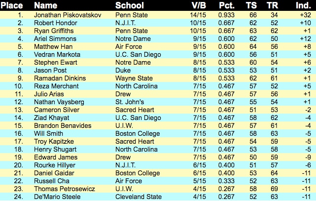 | 1997 | Penn State | Emmanuil Kaidanov | 1,530 | Notre Dame | 1,470 | Air Force |