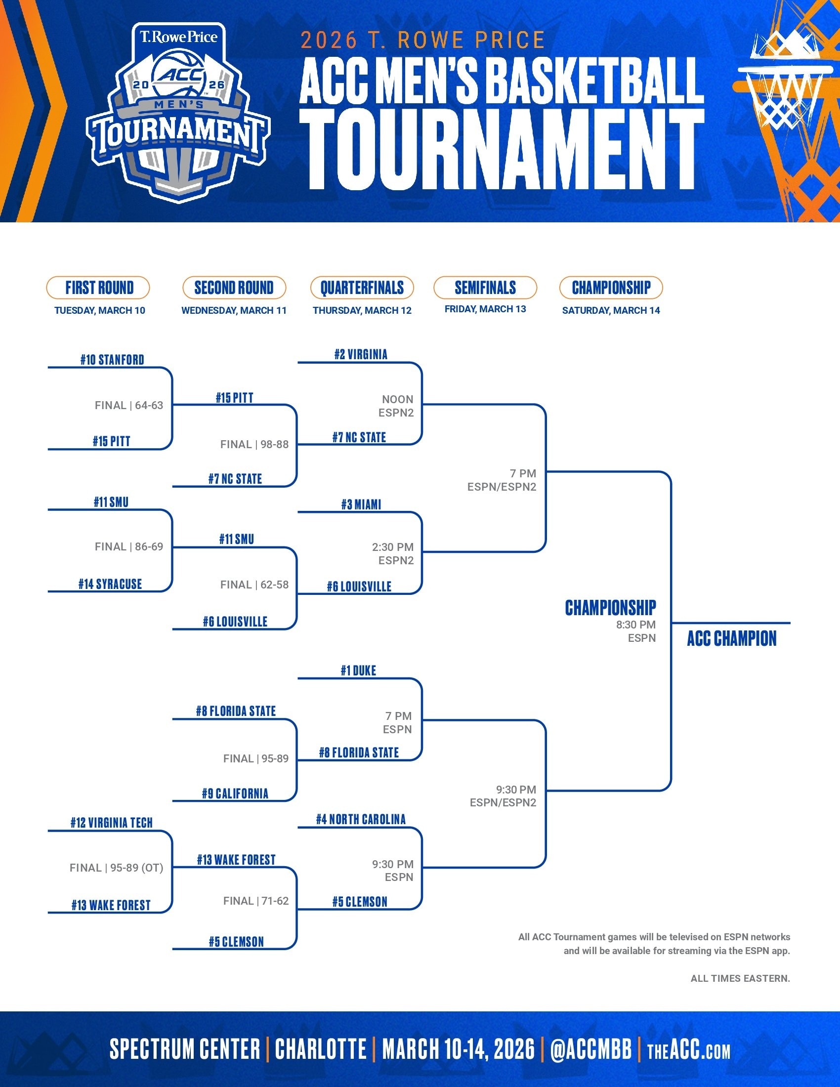 Check out the bracket, schedule and score information below. Duke won the 2025 conference crown, beating Louisville in the final.