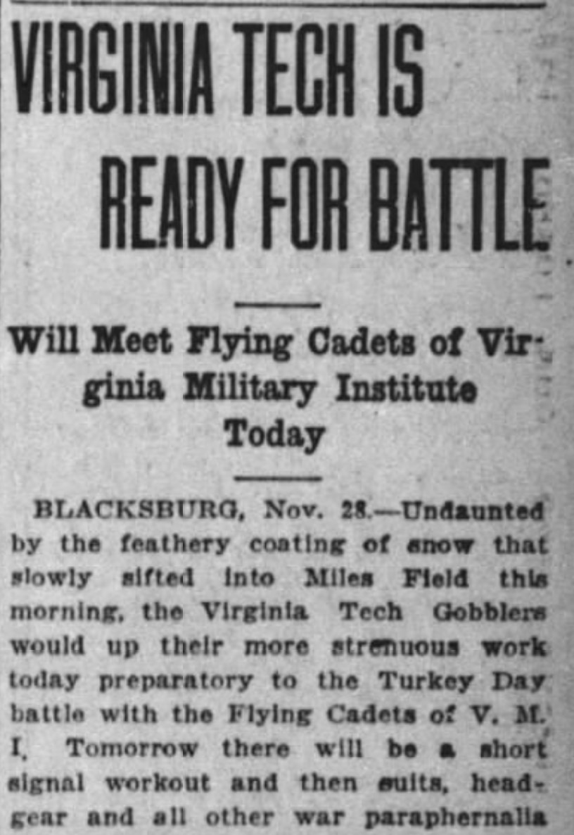 "Undaunted by the feathery coating of snow that slowly sifted into Miles Field this morning, the Virginia Tech Gobblers would up their more strenuous work today preparatory to the Turkey Day battle with the Flying Cadets of V.M.I.," the newspaper reported.