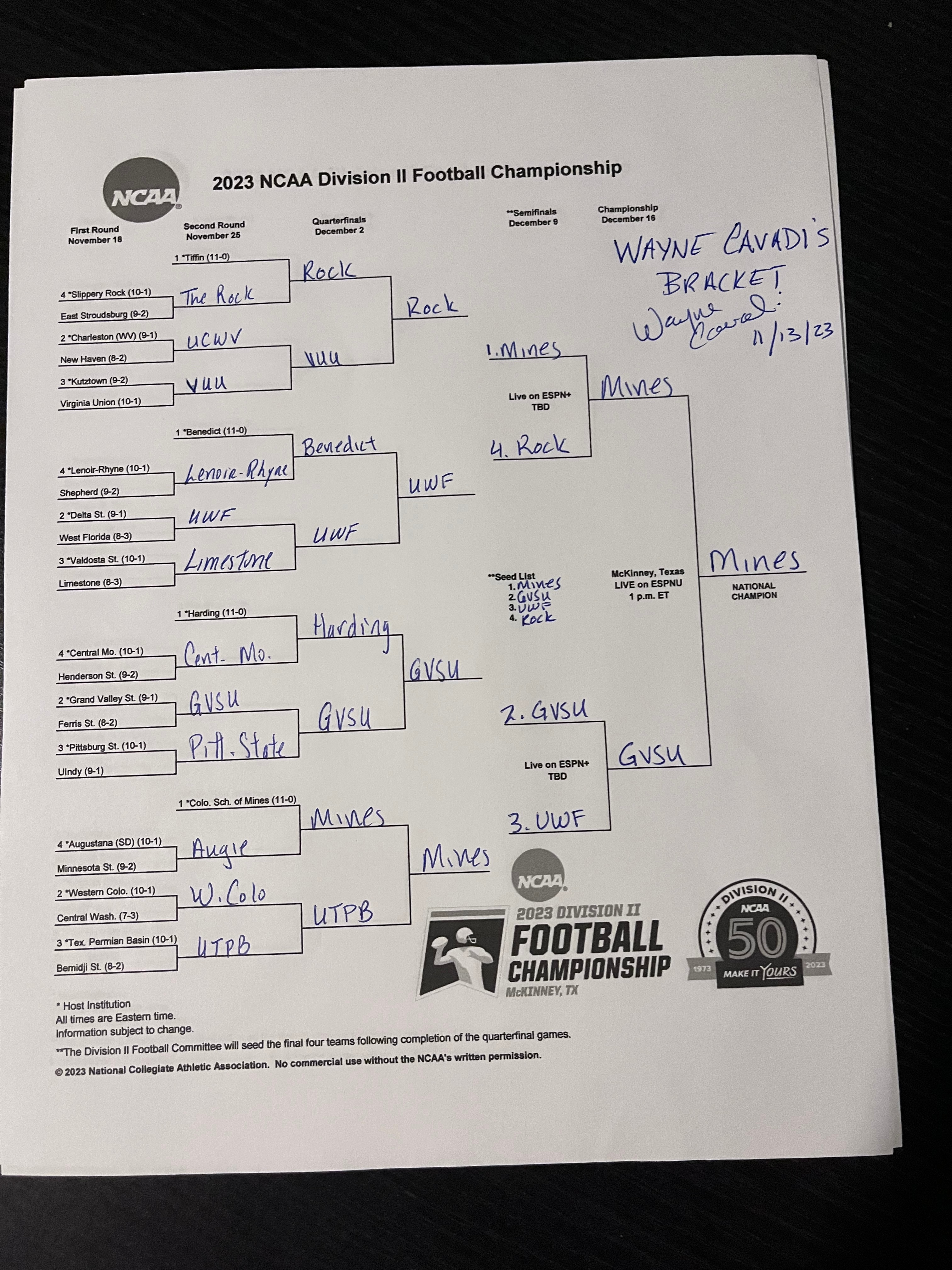 Below is the 2023 DII football championship bracket with my picks for every game. Please remember, I am simply the DII beat writer for WBD Sports and this in no way reflects any opinion of the NCAA or selection committee. It is done for fun, and if you have followed my work for any amount of time, you know I don't care at all when I am wrong. Why? Because that means there are probably crazy upsets happening, and that is good for all the fans. Now, sit back, yell at me on Twitter, and enjoy the road to McKinney.