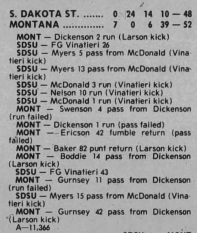 Montana's 39 fourth-quarter points are the most ever scored in a comeback win. The historic rally was punctuated by sophomore Dave Dickenson's go-ahead 42-yard touchdown pass to Scott Gurnsey with 21 seconds left in the game on a fourth-and-one play. Dickenson finished with four touchdowns and 401 passing yards in his first-ever collegiate start.