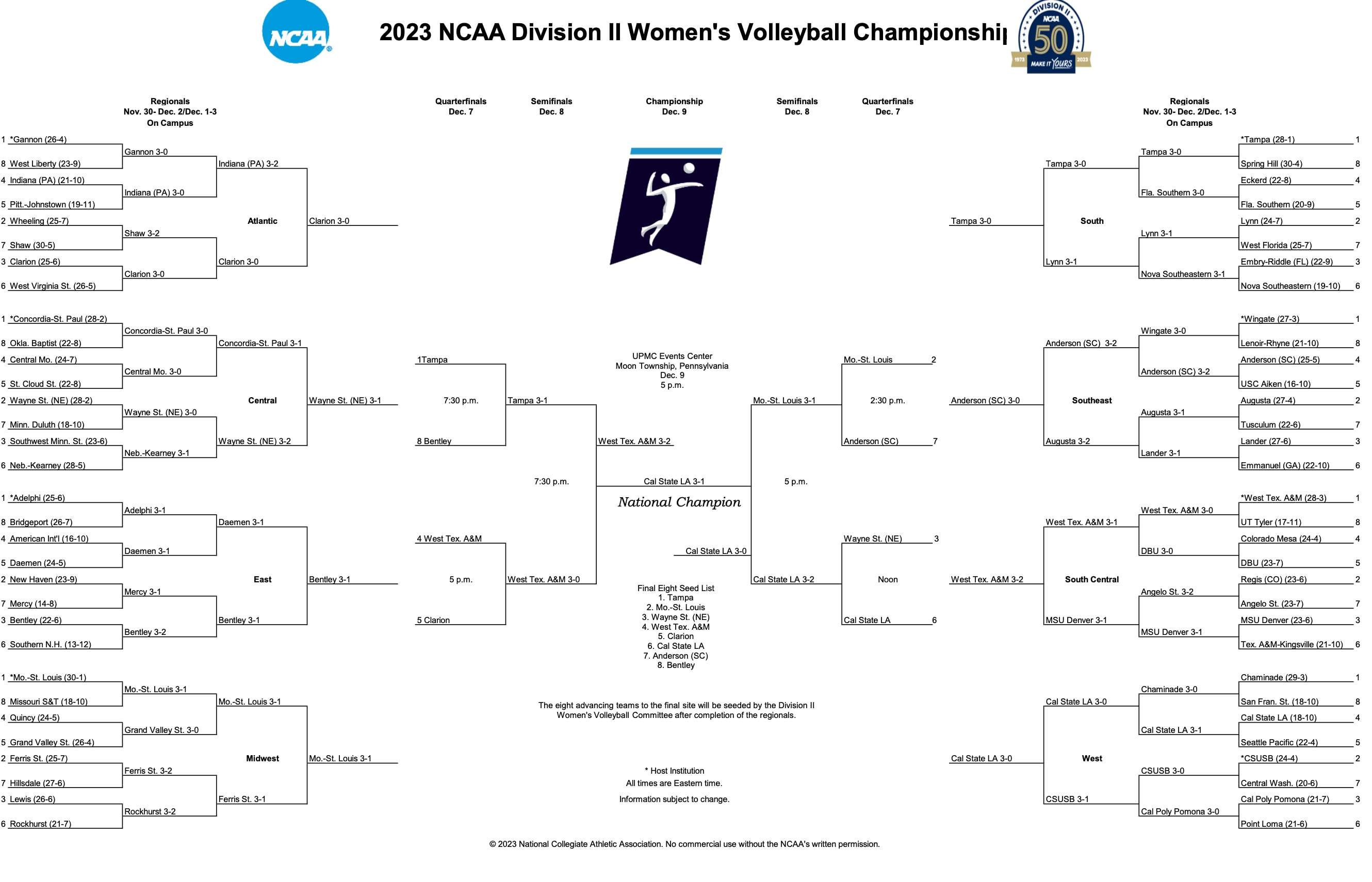 The 2023 NCAA DII women's volleyball championship began with selections on Nov. 20 and continued through the 2023 DII title match between Cal State-LA and West Texas A&M with Cal State LA defeating the defending champs 3-1.