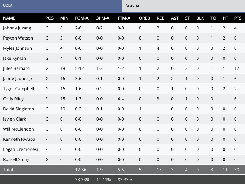 On the defensive end, has tried to create chaos for the Bruins, but UCLA has remained calm. Jaime Jaquez Jr. is perfect from field goal range (3-3) with six points tonight.