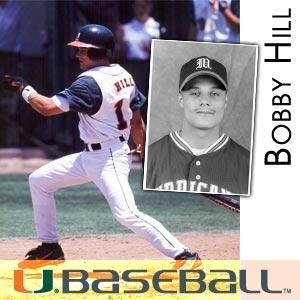 The two-time All-American hit .404 as a sophomore, the eighth-best single-season mark in program history, with 12 home runs, 59 RBI, 87 runs (the most in a season by a Miami player), a .625 slugging percentage, a .505 on-base percentage, and 46 steals. As a junior on the national champion Hurricanes, Hill led the team with a .391 batting average with 10 home runs, 30 RBI, 73 walks, 77 runs and 52 steals.