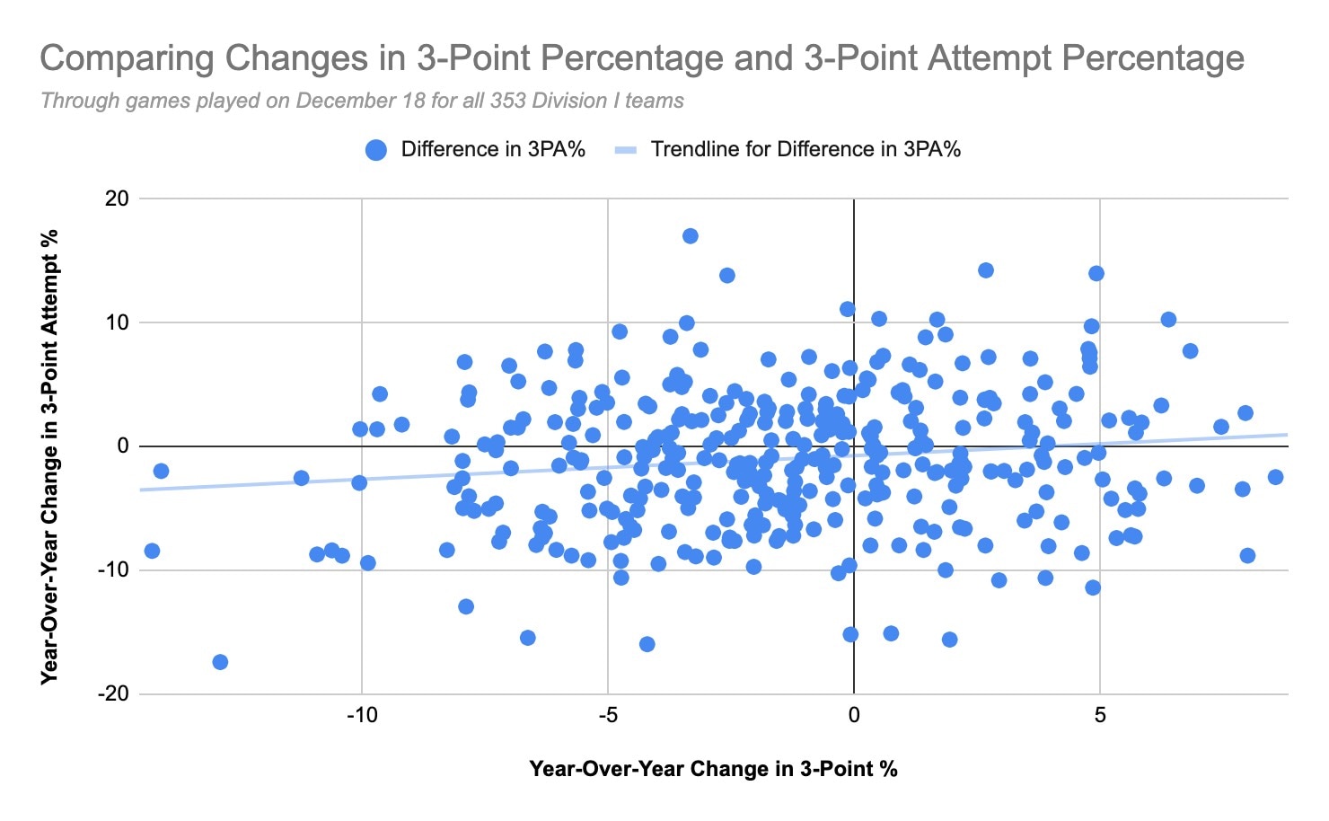 We graphed every Division I team's change in 3-point percentage from last season to this season, as well as each team's change in 3-point attempt percentage (meaning what percent of their total shot attempts were threes) from 2018-19 to 2019-20, and found that there isn't a sport-wide trend in changes in 3-point attempt percentage consistently affecting 3-point percentage.