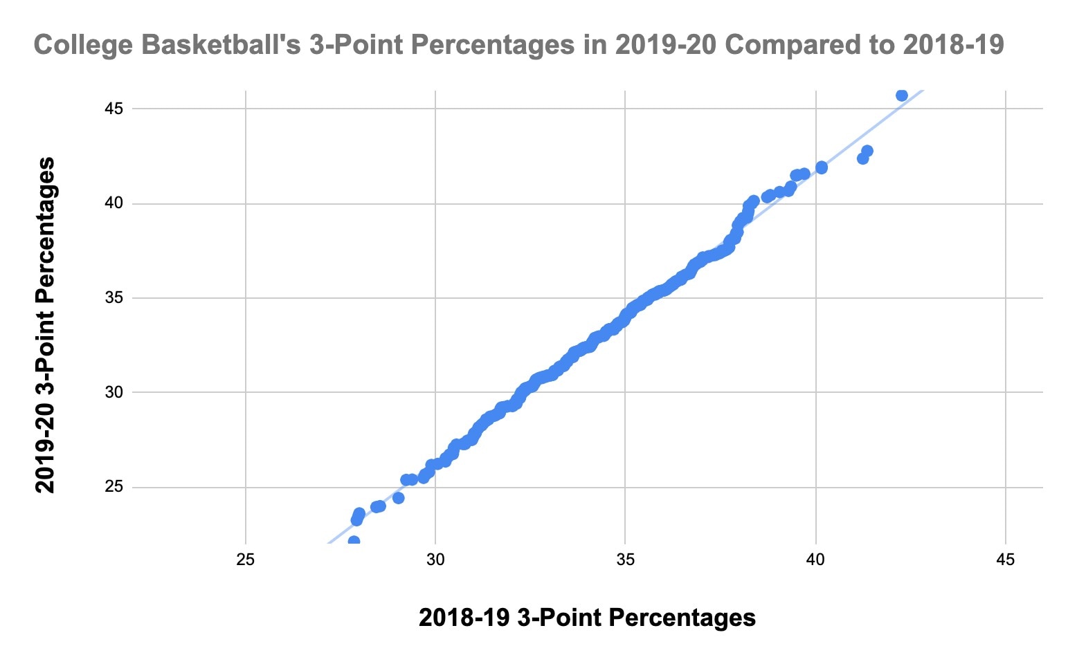 You'll see that around the 40-percent mark on the y-axis, which represents the current season, there start to be more points located above the trend line, showing a relative increase in 3-point percentage among the national leaders compared to last season. For example, this season's best 3-point shooting team, Saint Mary's, has a better 3-point percentage than the best 3-point shooting team last season, Lehigh, so the top point is above the trend line.