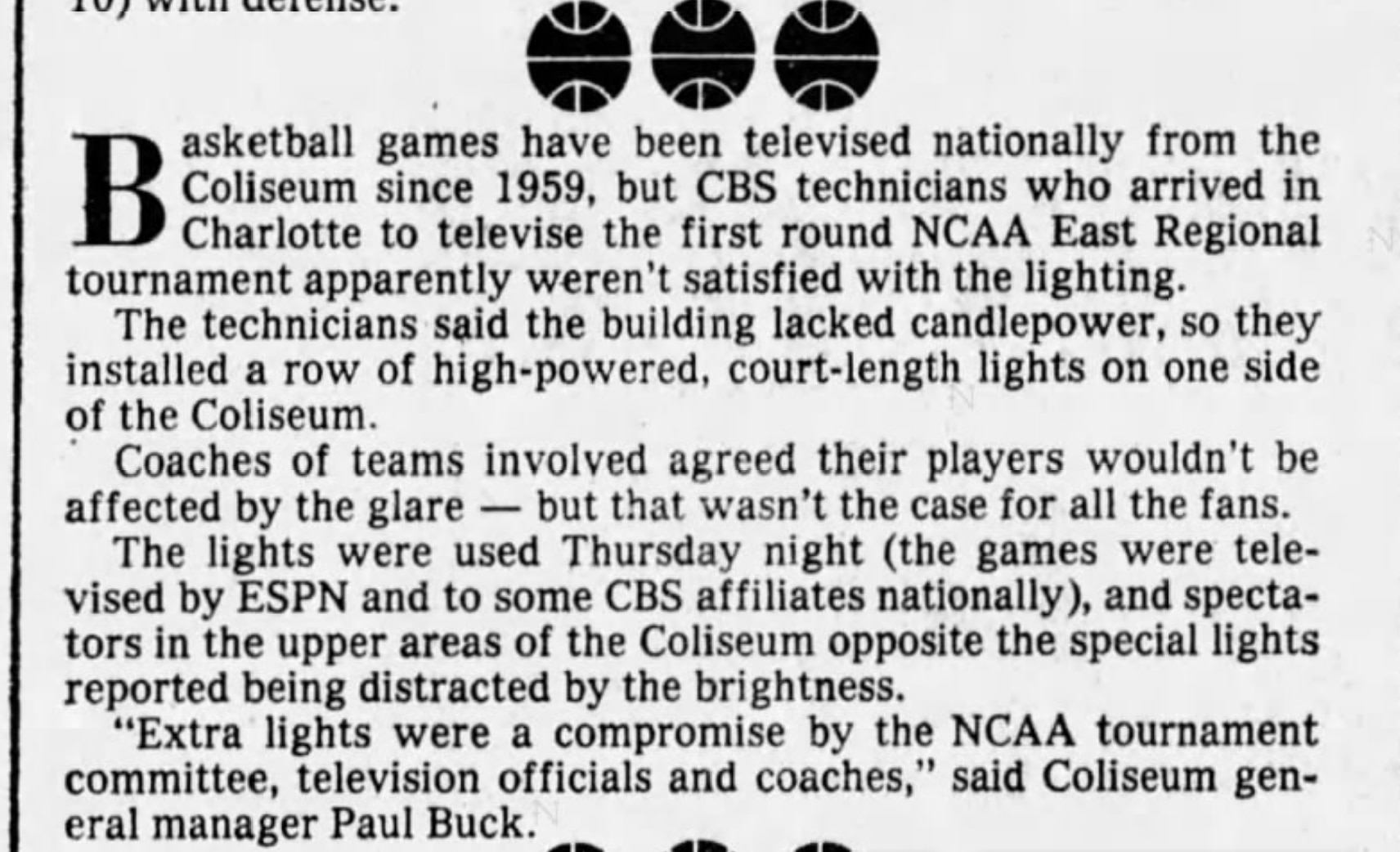 "The technicians said the building lacked candlepower, so they installed a row of high-powered, court-length lights on one side of the Coliseum," The Charlotte Observer reported in a notebook from the NCAA tournament. "Coaches of teams involved agreed their players wouldn't be affected by the glare โ€” but that wasn't the case for all the fans.