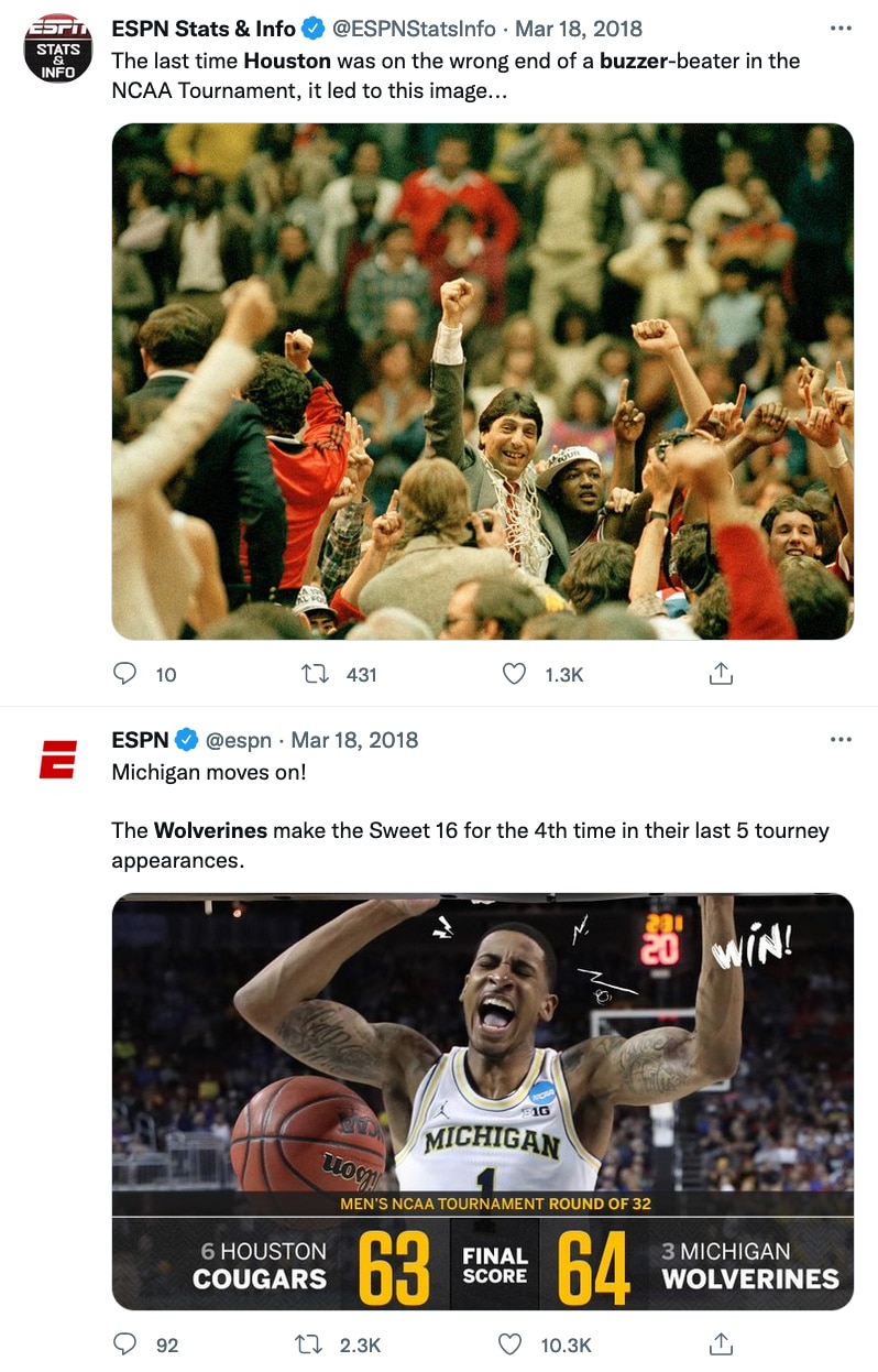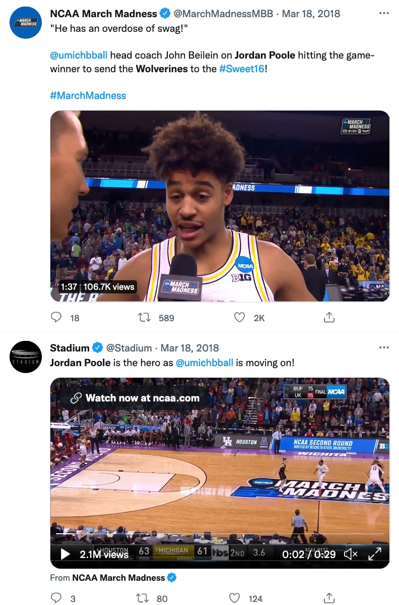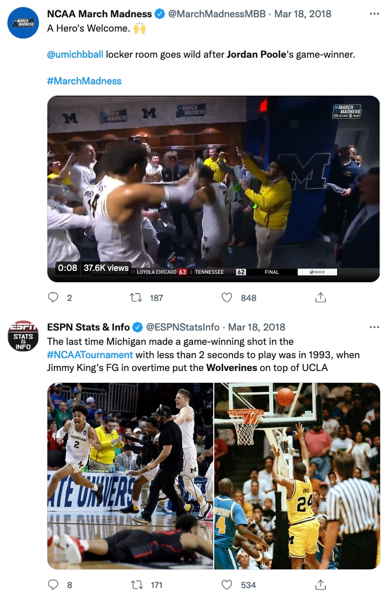 That was CBS' Brad Nessler's call of Michigan guard Jordan Poole's game-winning buzzer-beater over No. 6 seed Houston in the second round of the 2018 NCAA tournament — tied for the fifth-longest game-winning buzzer beater in the history of the NCAA men's basketball tournament — Michigan's 11th win in a row, en route to the Wolverines' eventual run to the national championship game for the second time in six seasons.