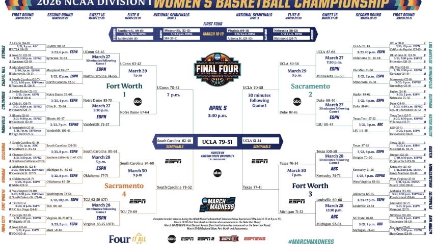- NCAA championship game: Sunday, April 5 at 3:30 p.m. ET on ABC, hosted at Mortgage Matchup Center in Phoenix