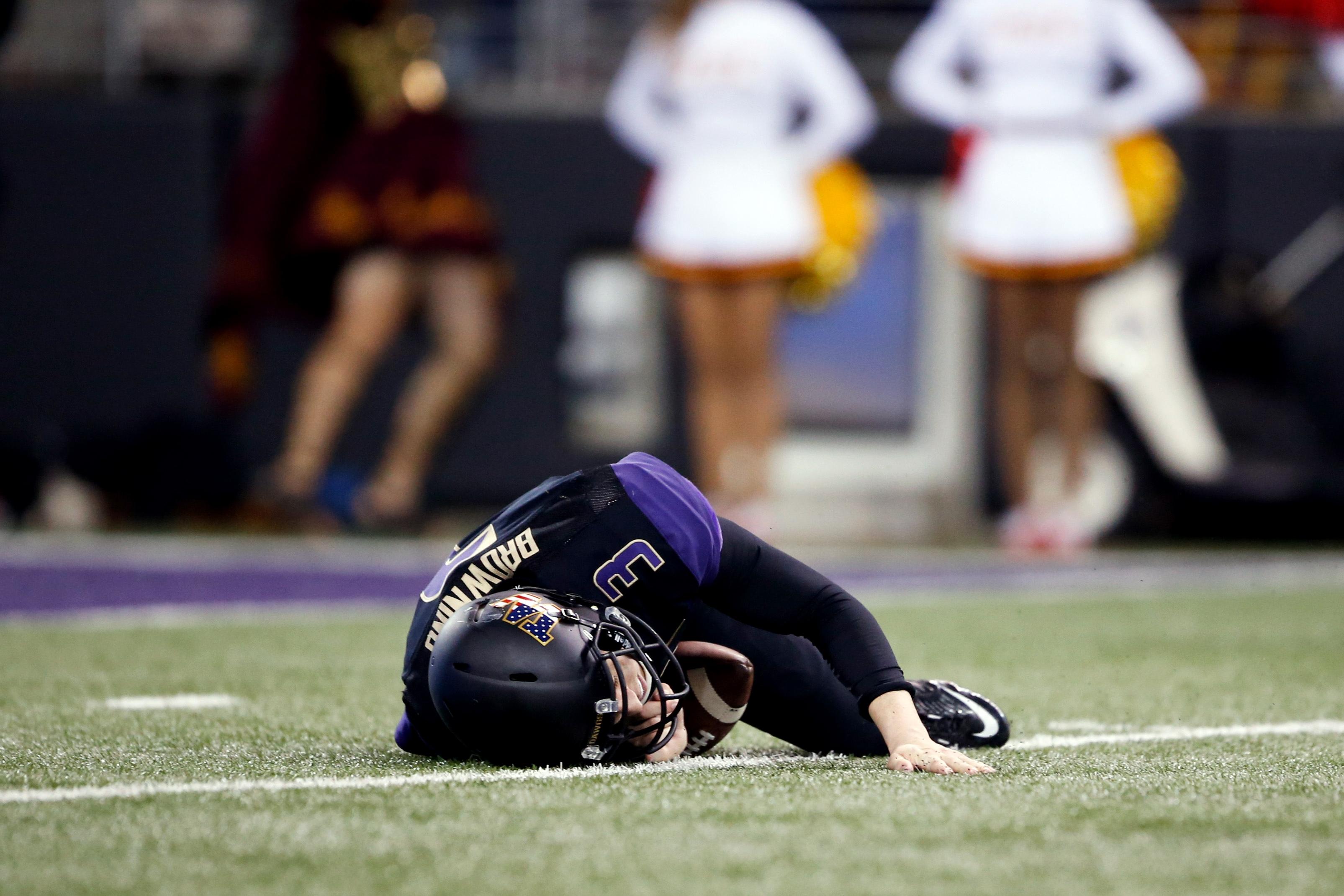 Washington quarterback Jake Browning lies on the field during the fourth quarter of the Huskies loss to USC