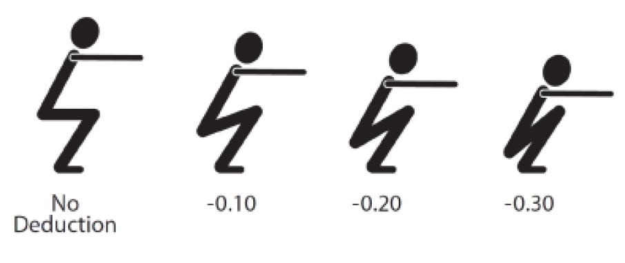 Another significant change this year is the âsquat on landingâ deduction. Gymnasts can still receive up to three-tenths for landing in a deep squat, but now gymnasts can land in a squat with their hips parallel to their knees and receive no deduction. Before this was a one-tenth deduction. Although this is not a deduction trap and will help athletes score better (and land safely!), it bears mentioning since itâs a significant change from previous years.