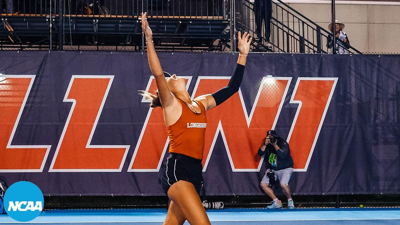 With one set separating Texas from repeating as champions, Longhorn Allura Zamarripa battled Sooner Alexandra Pisareva. Zamarripa won the first set, but Pisareva forced a tiebreaker in set two. Zamarripa won the tiebreaker 7-4, giving her the 7-5, 7-6 match-clinching victory. You can watch that full tie-breaker above.